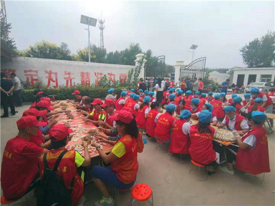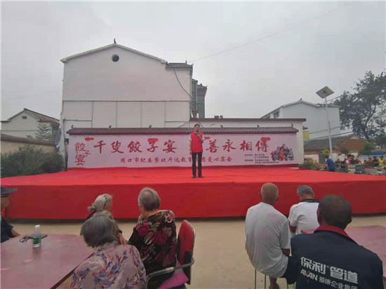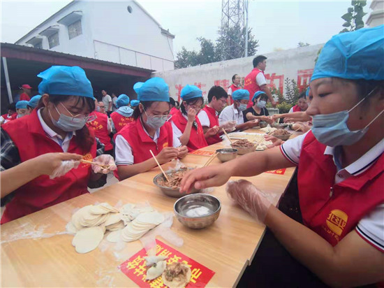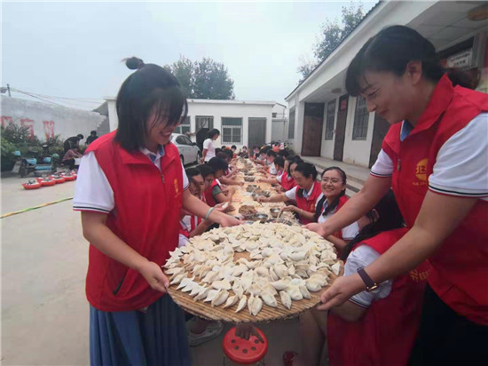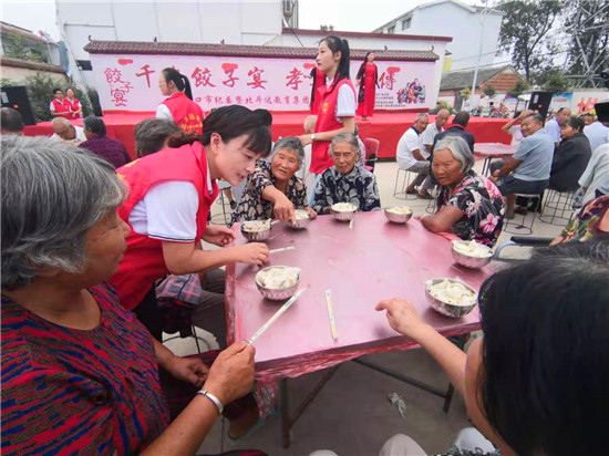 與此同時,在演出現場附近的村委大院內,由周口市慈孝文化促進會、北斗達教育集團等組成的200多名志愿團隊正忙得不亦樂乎,調餡、包餃子、下鍋、端盤,兩個多小時內,他們精心包出20000多個愛心水餃。11時30分,餃子宴正式開始,老人們一邊吃著水餃一邊觀看者演出,喜笑顏開,呈現出一片相親相敬的溫馨畫面。