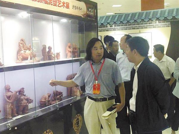 9月13日上午,2019年中國(guó)(鄭州)中秋文化節(jié)、中國(guó)農(nóng)民豐收節(jié)、國(guó)慶節(jié)“三節(jié)聯(lián)動(dòng)”系列傳統(tǒng)文化活動(dòng)在鄭州綠博園啟動(dòng)。鄲城縣泥塑藝人張振福受邀攜帶300多件泥塑作品參展,為活動(dòng)帶去了濃濃的鄉(xiāng)土味兒。圖為張振福正在向參觀群眾介紹作品。