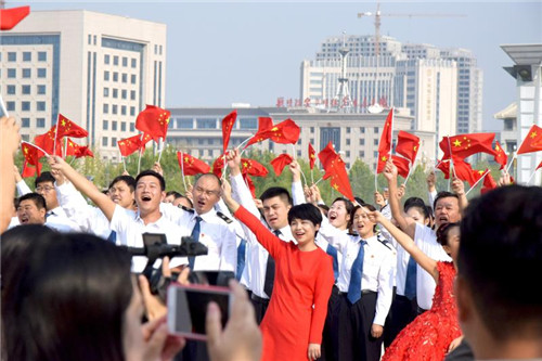 “我和我的祖國(guó),一刻也不能分割,無(wú)論我走到哪里,都流出一首贊歌……”9月29日上午,由市委宣傳部、市直機(jī)關(guān)工委主辦,周口報(bào)業(yè)傳媒集團(tuán)、周口廣播電視臺(tái)承辦的“學(xué)習(xí)強(qiáng)國(guó)——我和我的祖國(guó)”快閃活動(dòng)在和諧廣場(chǎng)舉行。來(lái)自市財(cái)政局、市城管局、市人民檢察院、市交通運(yùn)輸局、周口職業(yè)技術(shù)學(xué)院等市直單位近400人通過(guò)快閃形式歌唱祖國(guó),喜迎中華人民共和國(guó)成立70周年。