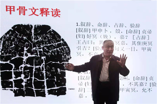 接著,在歷時兩個半小時的分享中,郝教授以融合發(fā)現(xiàn)、甲骨文字拆分、甲骨文書風(fēng)及甲骨文書法創(chuàng)作為立足點,襯以個人習(xí)書作品,從文化本義的內(nèi)涵、文化本義的要素、文化的生成和甲骨文的演化和發(fā)展等方面詳細闡述了文化的來源以及人類社會進步的過程。