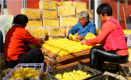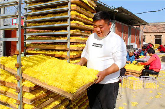 眼下,正值菊花盛開時節(jié),西華縣鑫豐菊花種植專業(yè)合作社160余畝菊花美不勝收,金黃色的菊花一望無際,清香撲鼻,令人陶醉。此時,在鑫豐合作社菊花烘干車間旁,數(shù)十位村民正挑揀、擺放菊花,歡聲笑語,好不熱鬧。