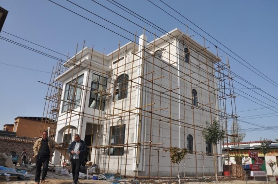 11月20日,在全國文明村——商水縣巴村鎮(zhèn)上城村,村民朱云山家的3層輕鋼別墅正在建造中。這是該村第一幢新式別墅,全框架結構,造型別致,沒有使用砂石、水泥、磚瓦等,全部使用新型環(huán)保建材,建造過程就像搭積木一樣,并具有節(jié)能環(huán)保、防風抗震、隔音防火、造價低廉、建造快等特點,很受喜歡。圖為附近村民前來參觀。記者 付永奇 攝