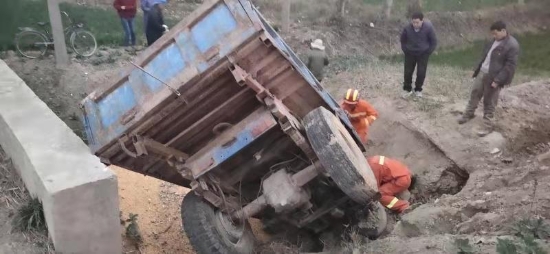 接警后,鄲城消防大隊(duì)立即出動(dòng)3輛消防車15名指戰(zhàn)員前往處置。經(jīng)偵查發(fā)現(xiàn),側(cè)翻車輛是一輛農(nóng)用三輪車,車上拉有約2噸散裝玉米?,F(xiàn)場(chǎng)玉米灑落一地,駕駛員約六十歲,左腿被農(nóng)用三輪車前輪壓住,無(wú)法脫身,加之即將天黑,當(dāng)時(shí)天氣較冷,如不及時(shí)處置,后果不堪設(shè)想。