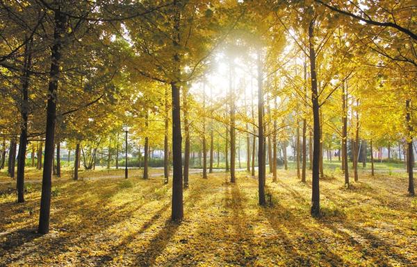 近日,周口市經(jīng)濟(jì)開發(fā)區(qū)人民廣場,金黃色的楊樹葉在陽光照耀下熠熠生輝,給城市增添一抹亮色。張振海 攝