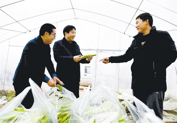 近日,周口報業(yè)傳媒集團(tuán)幫扶村——淮陽縣馮塘鄉(xiāng)劉莊村的扶貧蔬菜大棚最后一棚辣椒采摘上市。據(jù)了解,這里產(chǎn)的辣椒個頭大、口感好,很暢銷。圖為周口報業(yè)傳媒集團(tuán)黨委副書記、總編輯、周口日報社總編輯顧玉杰(中)向種植戶了解辣椒銷售情況。 記者 梁照曾 攝