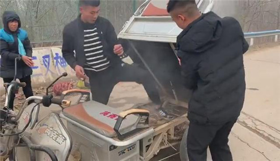 “當(dāng)時(shí)在我們前方的一輛電動(dòng)三輪車駕駛座下冒出黑煙,車上兩位老人察覺到危險(xiǎn)后,急忙下車,站在一旁不知所措。我們也緊跟上前。事發(fā)突然,現(xiàn)場(chǎng)沒有滅火器和可利用水源,而三輪車的火越來越大,兩位老人著急萬分,在旁邊不停地請(qǐng)求我們幫幫她們。根據(jù)經(jīng)驗(yàn),我們當(dāng)機(jī)立斷利用路邊的泥土進(jìn)行撲救,經(jīng)過幾十秒的緊張撲救,著火部位被成功撲滅。”三位消防隊(duì)員回憶說三輪車是電線短路引起的電瓶著火。
