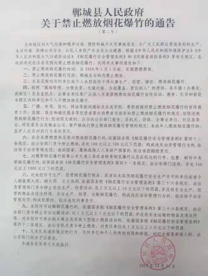 鄲城縣人民政府關于禁止燃放煙花爆竹的通告