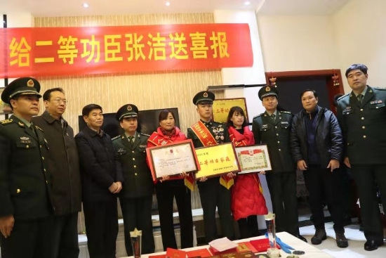 當日上午,張潔的老家鑼鼓喧天,熱鬧非常。軍地領(lǐng)導在鄉(xiāng)親們熱烈地掌聲和鑼鼓聲中,帶著滿滿地祝福,專程趕到張潔家中。“張潔同志,在國際軍事比武競賽中取得第一名,榮立二等功為此特向您報喜。希望您今后多與部隊聯(lián)系,多給予張潔同志鼓勵,為實現(xiàn)中華民族偉大復興的強國夢、強軍夢共同奮斗。”在張潔家中,69246部隊副政委楊富鵬代表組織宣讀了部隊賀信。