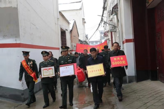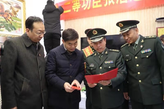 隨后,周口軍分區(qū)政治部主任李揚,太康縣委副書記、政法委書記劉海艇,縣委常委、副縣長韓維俊,縣委常委、人武部部長于永前,人武部政委郭立君等領(lǐng)導給張潔的母親盧靈芝送去了立功喜報、二等功臣家庭牌匾和慰問品、慰問金。