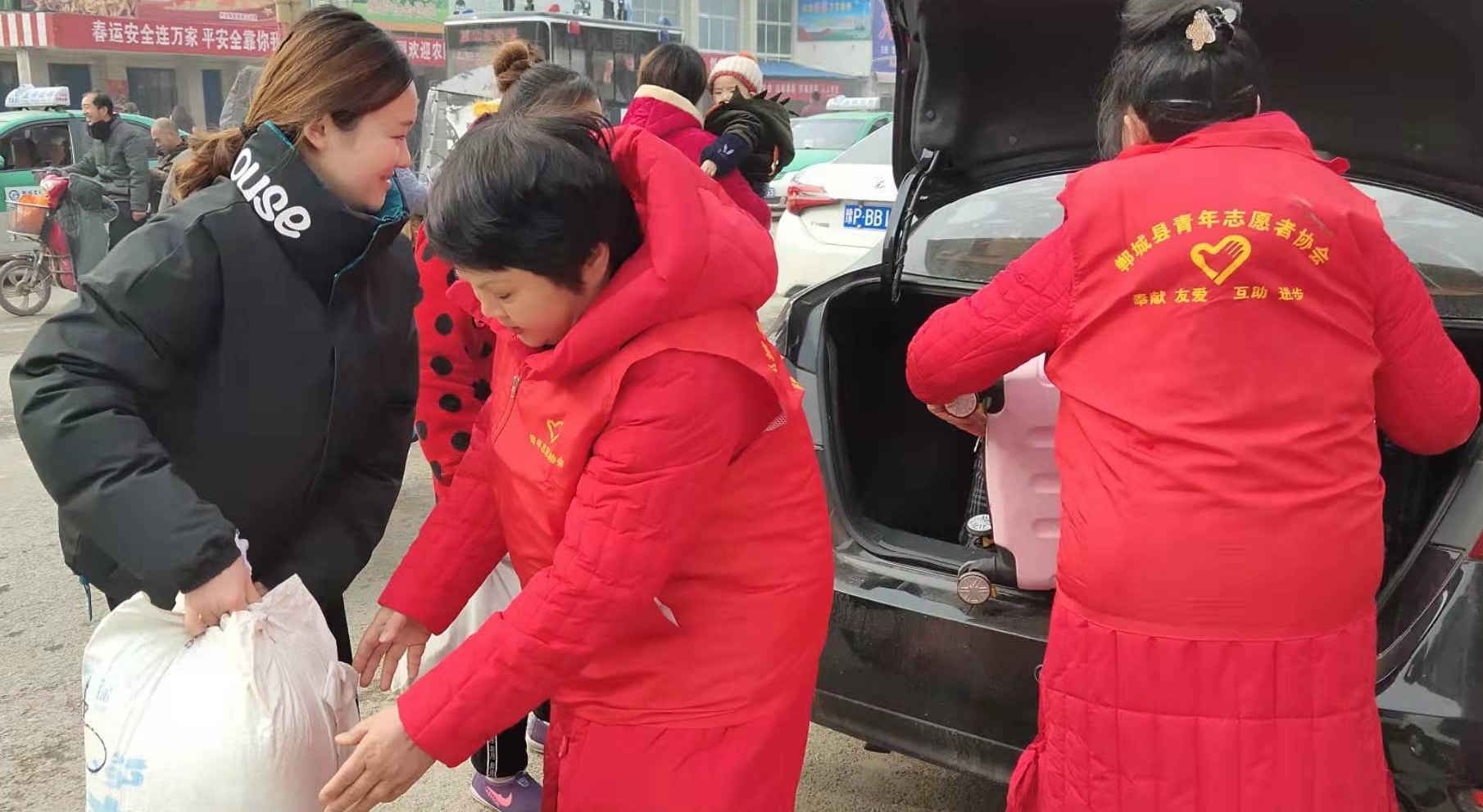 1月13日,寒意襲人,在鄲城汽車(chē)站30多名志愿在車(chē)站門(mén)外忙著給上、下車(chē)的老鄉(xiāng)推拉箱、拿行李,一句“歡迎老鄉(xiāng)回家過(guò)年”溫暖著旅客們的心。