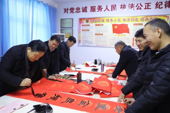 年末歲尾,我市書(shū)法家們到農(nóng)村、進(jìn)社區(qū)為群眾們義寫(xiě)春聯(lián),成為節(jié)前一道靚麗風(fēng)景線。1月16日,我市6位知名書(shū)法家來(lái)到周口港區(qū)公安分局,特意為節(jié)日期間還要堅(jiān)守工作一線的公安民警、輔警現(xiàn)場(chǎng)寫(xiě)春聯(lián),送祝福。