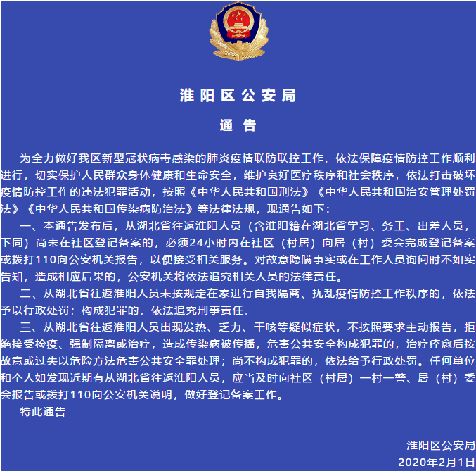 今天,淮陽(yáng)區(qū)公安局發(fā)通告:從湖北返淮人員務(wù)必24小時(shí)內(nèi)……