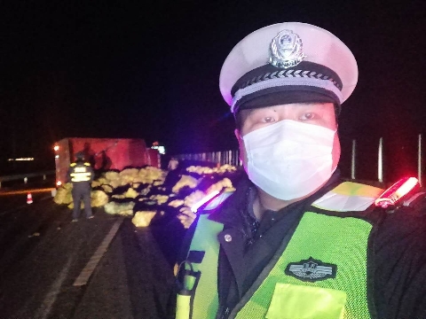 2月15日晚,一輛滿載著蔬菜的大貨車在大廣高速周口轄區(qū)內側翻,一車娃娃菜傾倒在高速路上,占據了兩個車道,急需救援。市公安局交通管理支隊高速二大隊民警接警后迅速救援,幫助運送保障物資的司機先去送貨,再回來處理事故。