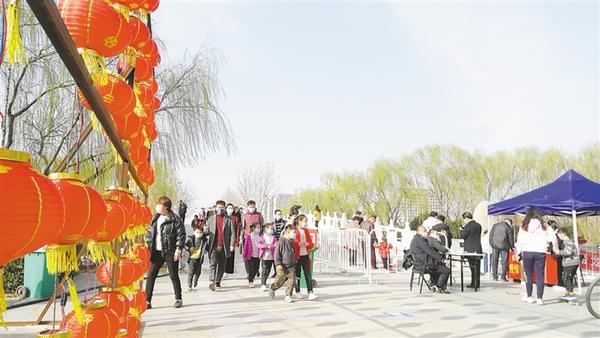 記者沿周口公園主干道向里走看到,路旁的花燈鮮艷奪目,如意湖邊楊柳依依,園內(nèi)迎春花開(kāi)、玉蘭飄香,滿園春色如期而至。記者發(fā)現(xiàn),游客們?nèi)齼蓛傻?,主要以家庭為單位一起游玩,沒(méi)有出現(xiàn)扎堆現(xiàn)象。