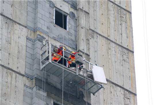 當(dāng)日上午,記者在施工現(xiàn)場(chǎng)看到,樓體外部,工人們隨著升降吊籃的上下正在緊張有序地進(jìn)行外墻保溫施工;樓體內(nèi),工人們正在進(jìn)行內(nèi)墻的粉刷及水泥地板的鋪設(shè),里里外外一派忙碌的景象。