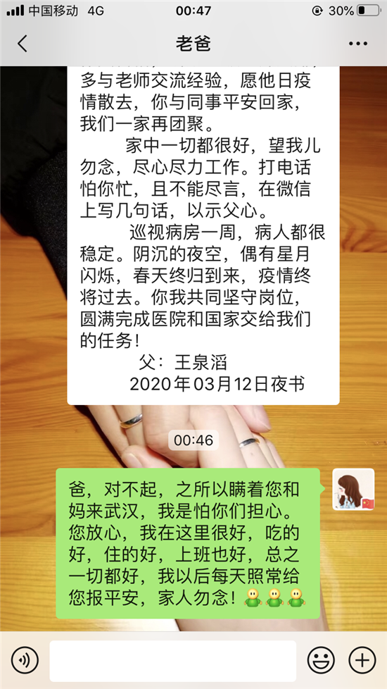 3月21日,周口援鄂醫(yī)療隊出征滿一月。當(dāng)晚,王泉滔通過微信又鄭重給女兒說下這番話:一晃你在武漢一個月了,我和家人從你去武漢的擔(dān)心到現(xiàn)在的放心,這是國家給予我們的安心。農(nóng)民把地種好,教師把學(xué)教好,士兵把國門守好,醫(yī)護把病治好,都是自己的使命,更是自己的初心。人人懷揣私字,社會必敗,遭殃的終歸眾人;眾人心懷天下,萬物皆勝,受益的定是人人??吹胶幽喜糠衷踽t(yī)療隊從武漢凱旋歸來,雖然沒有你的身影,但是我們很高興,說明武漢的疫情已得到控制,我和家人一起期盼你早日歸來。但是還是要再次叮囑你,不要因為疫情到了最后而放松警惕,上下班路上注意安全,穿脫防護服不能有一絲懈怠,時刻保持警醒。年前你當(dāng)了姑姑,雖然還沒有見到你侄子,但他和家人共同期待你平安回來。吾兒加油!
