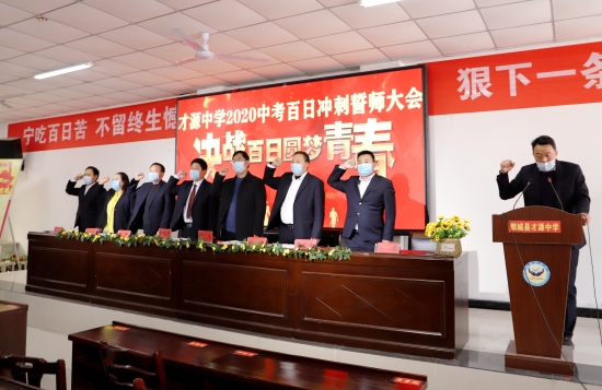 破釜沉舟、萬千學子爭咫尺;臥薪嘗膽、龍門陣里苦熬頭。全力以赴、用勤奮改變人生;永不言改、以執(zhí)著成就未來……3月22日,鄲城縣才源中學組織60名師生在學校主會場,以視頻直播“隔空對話、隔屏傳情”的方式,和全校三年級師生一起開展中考百日誓師大會。