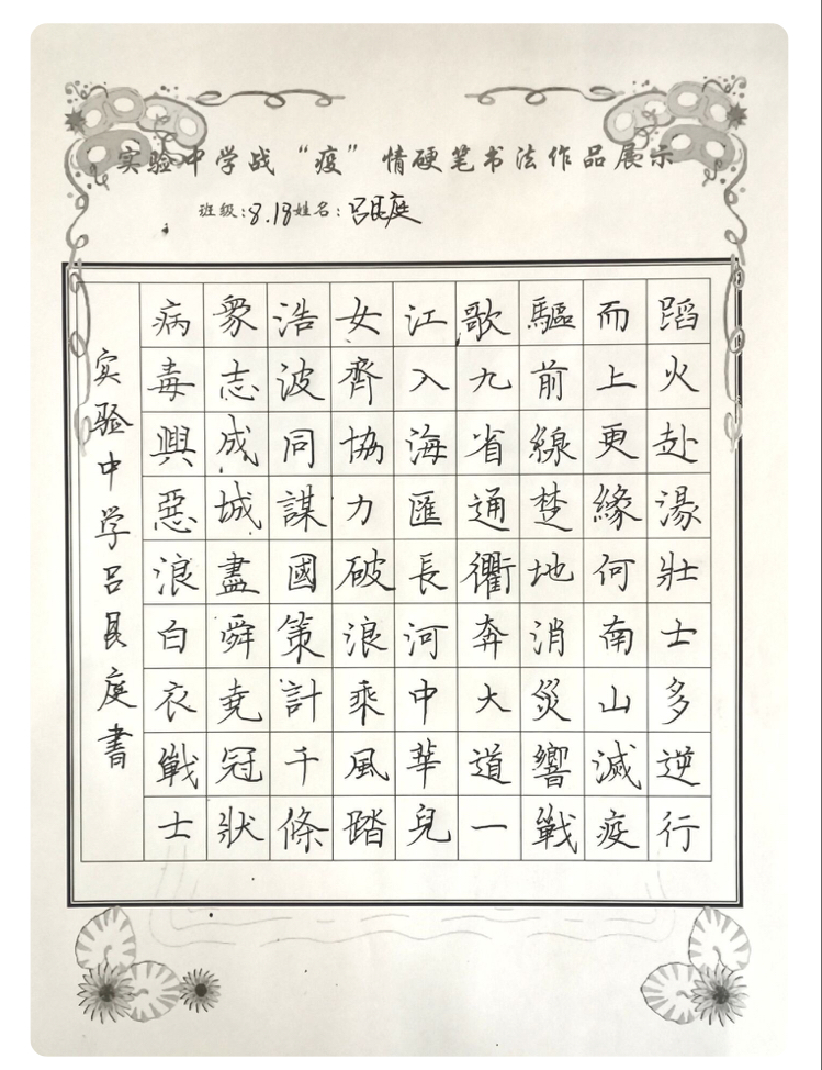 “赴湯蹈火壯士多,逆行而上更緣何。南山滅疫驅(qū)前線,楚地消災(zāi)響戰(zhàn)歌。九省通衢奔大道,一江入海匯長河。中華兒女齊協(xié)力,破浪乘風踏浩波......”扶溝縣實驗中學(xué)“萬眾一心 抗擊新冠”硬筆書法比賽中,八(18)班呂艮庭同學(xué)鄭重地抄錄了這首律詩。