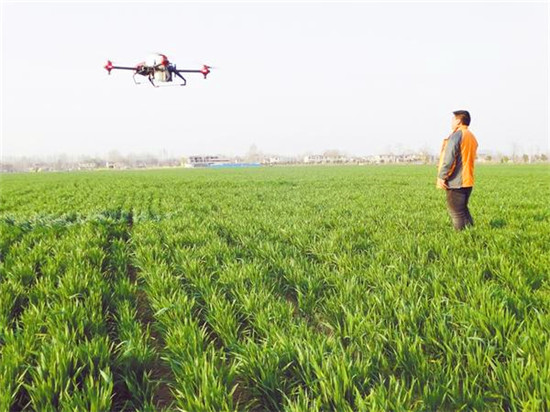 3月24日,在沈丘縣周營鎮(zhèn)平安農(nóng)業(yè)種植合作社訂單優(yōu)質(zhì)小麥種植基地,身穿“黃馬甲”的小麥飛防技術(shù)員正操作無人機,進行“一噴多防”病蟲害防治,為夏糧豐產(chǎn)豐收奠定基礎(chǔ)。謝辛凌 攝