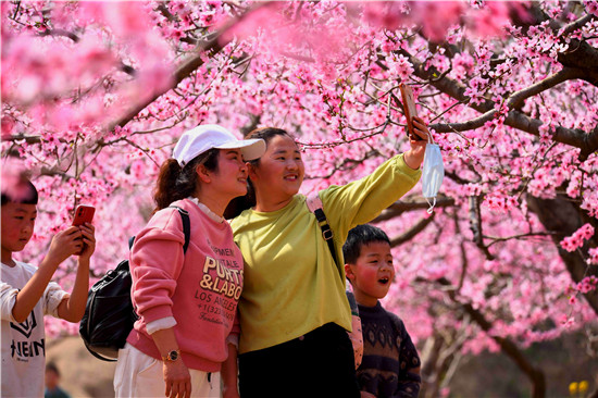 而在萬畝桃花深處,賞花的人們也是醉不知歸。大人孩子們神采飛揚,追逐賞花,探幽覓芳,玩得很嗨!還有一個時尚的人們,在桃花深處玩抖音、玩直播、拍視頻,與天下網(wǎng)友共賞花海之美。