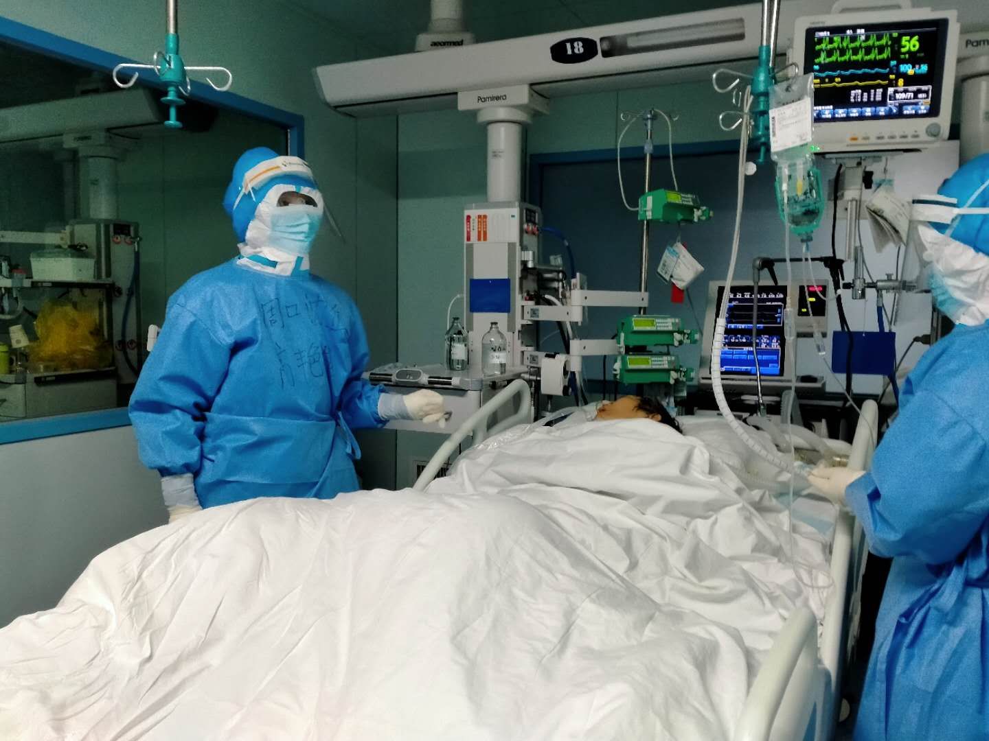 高艷艷說(shuō),除了多穿一層防護(hù)服,其他的跟平時(shí)的工作差不多。不同的地方,主要體現(xiàn)為兩點(diǎn),一就是從接班到交班,所做的所有工作都多了一份被感染的風(fēng)險(xiǎn)。二就是救治存在的難點(diǎn)多、棘手的問題多、突發(fā)事件比較多,比如說(shuō):新冠肺炎患者發(fā)展到危重期,特別是病程較長(zhǎng)的病人,肺大多爛掉了,多數(shù)病人上有呼吸機(jī),這樣的病人極易出現(xiàn)氣胸。有一次值班期間,一位56歲的男性患者,突發(fā)氧分壓下降、煩躁、血壓下降、出汗,急查胸片證實(shí)氣胸,緊急給予了胸腔穿刺閉式引流,病人癥狀才得以緩解。氣胸雖然在臨床上很常見,但對(duì)于新冠肺炎病人卻如同雪上加霜,不緊急處理病人很快就會(huì)死掉。每一個(gè)搶救的場(chǎng)面如同一場(chǎng)激烈的戰(zhàn)場(chǎng),而戰(zhàn)斗隨時(shí)會(huì)打響,但你卻根本無(wú)法預(yù)測(cè)哪一次戰(zhàn)斗會(huì)在哪一個(gè)時(shí)刻打響,所以值班時(shí)每位醫(yī)師都會(huì)慣性地緊盯著每個(gè)數(shù)值、各個(gè)參數(shù)……