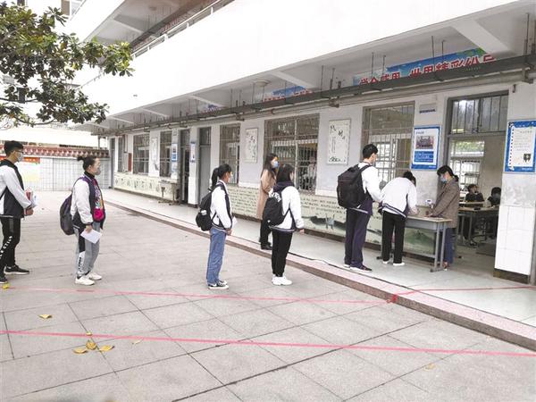 4月20日6時50分,記者在周口四中門口看到,學生們在家長的陪伴下陸續(xù)趕來,按照學校提前下發(fā)的入校流程,在校門口間隔一米距離有序排隊。然后,他們按規(guī)定依次遞交健康承諾表后,在值班教師的引導下,通過大門兩側設置的體溫測試通道入校,每個通道處都有工作人員負責引導學生、噴灑消毒液。