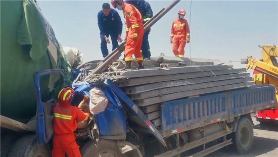 4月26日11時(shí)許,西華縣逍遙鎮(zhèn)加河灘村穎河橋發(fā)生一起車禍,一輛拉石板的貨車和一輛水泥罐車相撞,貨車在強(qiáng)大的慣性下車頭嚴(yán)重變形,司機(jī)被困車中,而貨車的駕駛室也被由于慣性發(fā)生前傾的石板壓住,情況十分緊急。周口市消防救援支隊(duì)西華縣消防大隊(duì)接到報(bào)警后立即出動2車10人趕赴現(xiàn)場展開救援。