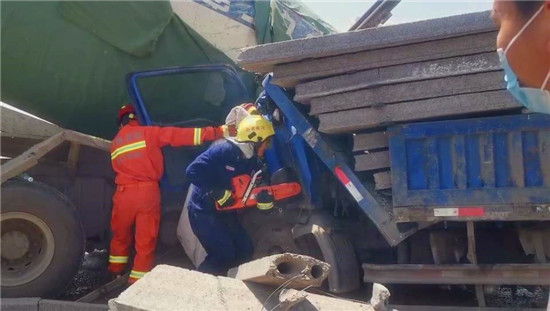 據(jù)了解,由于兩車相撞產(chǎn)生的沖擊力導(dǎo)致貨車與水泥灌車的車體緊緊連在一起,貨車駕駛員被卡在駕駛位上無法動彈。為了能盡快將被困司機(jī)救出來,現(xiàn)場指揮員指揮救援人員協(xié)助現(xiàn)場交警、路政部門立即對事故路段進(jìn)行封鎖處理,并設(shè)置安全員對過往車輛進(jìn)行警示,保證救援工作正常開展。同時(shí),另一組救援人員首先對壓住駕駛室的石板進(jìn)行清理,然后使用液壓器材工具組進(jìn)行破拆,并對駕駛員腿部被擠壓部位進(jìn)行擴(kuò)張。經(jīng)過十五分鐘的緊急救援,被困司機(jī)被成功救出后移交現(xiàn)場救護(hù)車送往醫(yī)院治療。