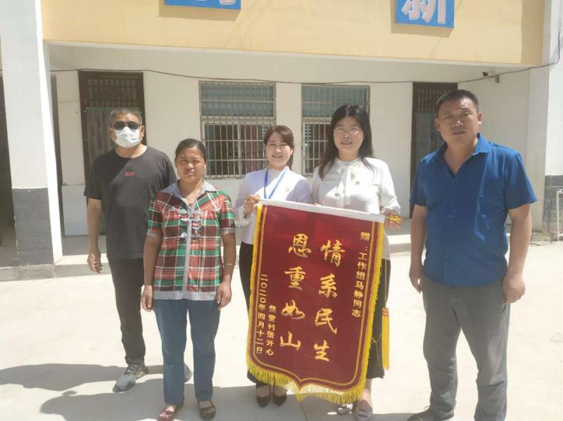 5月19日,太康縣王集鄉(xiāng)焦堂行政村張草帽自然村村民萬勤霞來到焦堂村小學(xué),將一面繡有“情系民生 恩重如山”的錦旗送到了該縣紀(jì)委常委、監(jiān)委委員馬靜,工作組成員王向花、馬景華、張海亮手中,感動(dòng)的淚水忍不住地流。