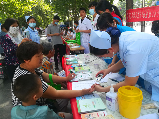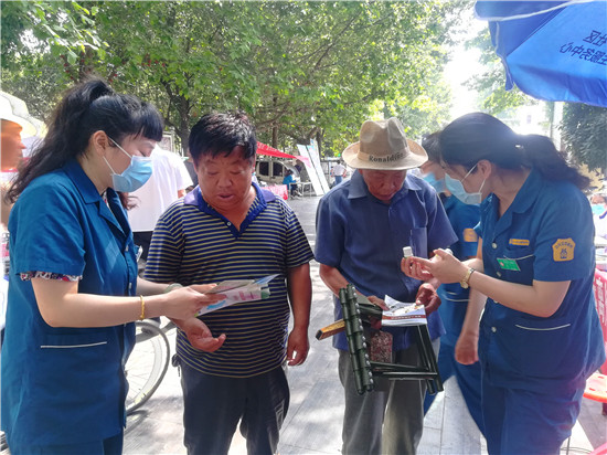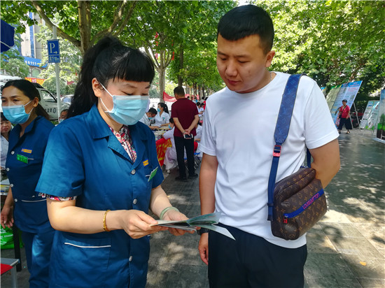 活動現(xiàn)場,參加宣傳活動的各單位工作人員為市民散發(fā)宣傳相關(guān)資料,并為市民進(jìn)行義診。