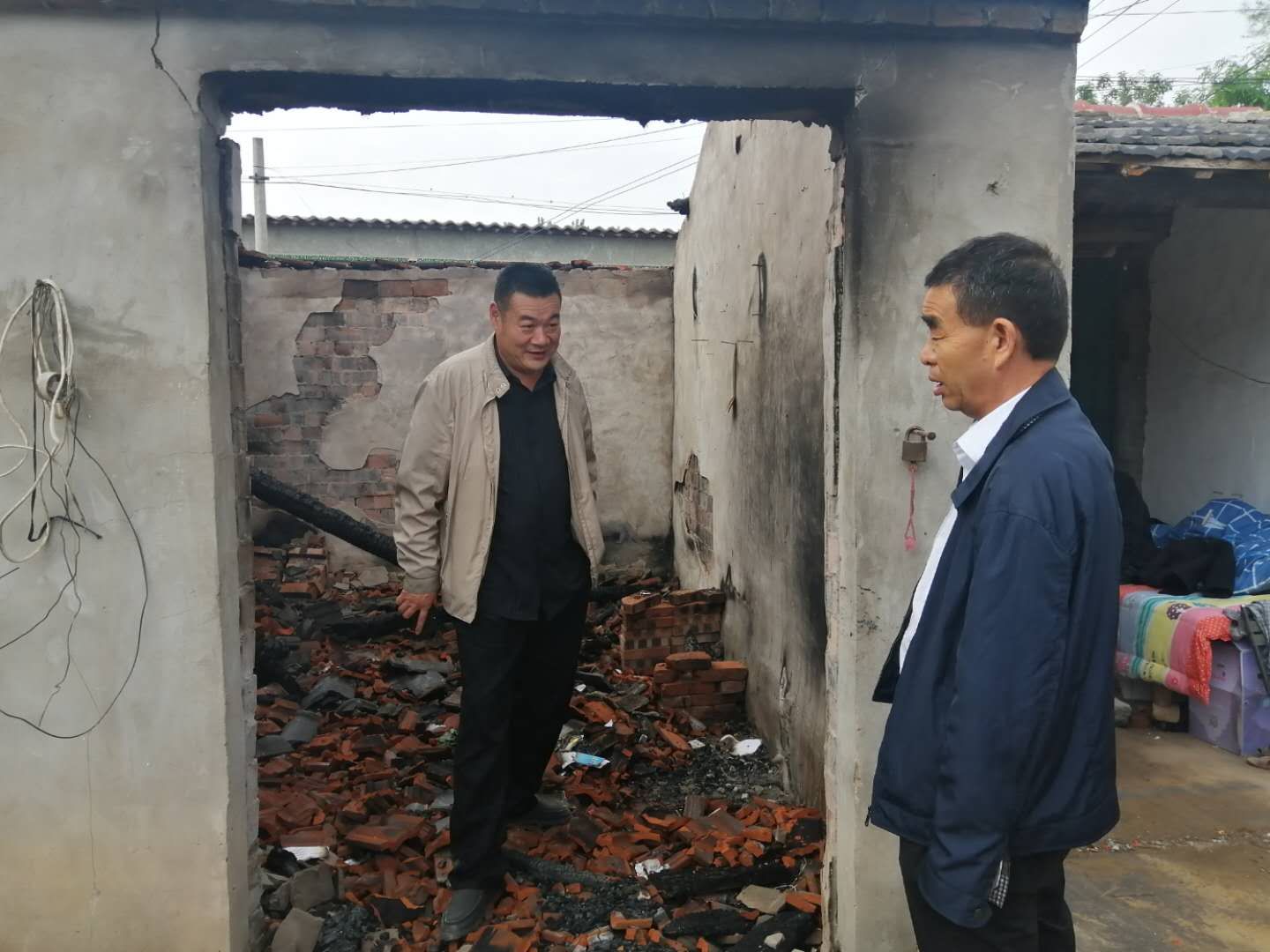 聽完情況后,督導組立刻和駐村工作人員一起到李洪范家查看情況,現場主屋已經全部燒毀,屋里到處是瓦礫......李洪范站在被燒毀的房屋里,表情木納的自言自語道“燒得一干二凈,什么都沒了,這以后咋弄呀?!爆F場詢問其生活情況時,李洪范說,“當天,鄉(xiāng)里邊就送來了米、油和錢。村長也送來了幾件衣服,現在就是沒有地方住。”