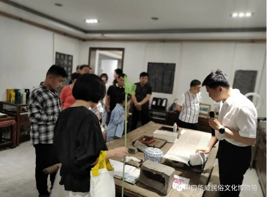 由于當(dāng)天是禮拜六,孩子們和大人來的特別多,陸陸續(xù)續(xù),穿梭不停,其中最大的一個(gè)游客團(tuán)由20多人,孩子們牽著大人的手,游百獅園,參觀華威綜合展廳的木質(zhì)榨油機(jī)和書畫,到華威學(xué)堂看拓片技藝,觀看香文化。