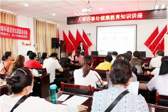 18日下午, “健康周口行 大醫(yī)獻愛心”健康教育志愿服務隊應邀走進川匯區(qū)人和辦事處,為干部職工和轄區(qū)居民作了《保持健康生活方式、掌握幸福長壽鑰匙》講座。講座現(xiàn)場,來自周口市中心醫(yī)院心內(nèi)四科的劉華玲主任利用ppt課件,分別從健康基本知識和理念、健康生活方式與行為及健康基本技能做了詳細分析講解,圍繞健康四大基石,結合群眾常見健康知識誤區(qū),對所講內(nèi)容進行總結概括,進一步加深了轄區(qū)居民對健康素養(yǎng)知識的理解。同時,結合真實病例,深入淺出地為大家講解了高血壓的基本概念、分類、高血壓治療原則和目標、難治性高血壓的處理等,重點強調(diào)了高血壓常見危險因素及預防措施。
