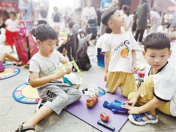 記者在現(xiàn)場(chǎng)看到,小朋友拉起了橫幅,擺上了玩具,搖身一變“小掌柜”,紛紛拉貨練攤、討價(jià)還價(jià)、吆喝售賣。