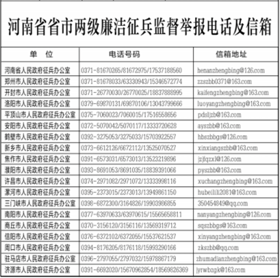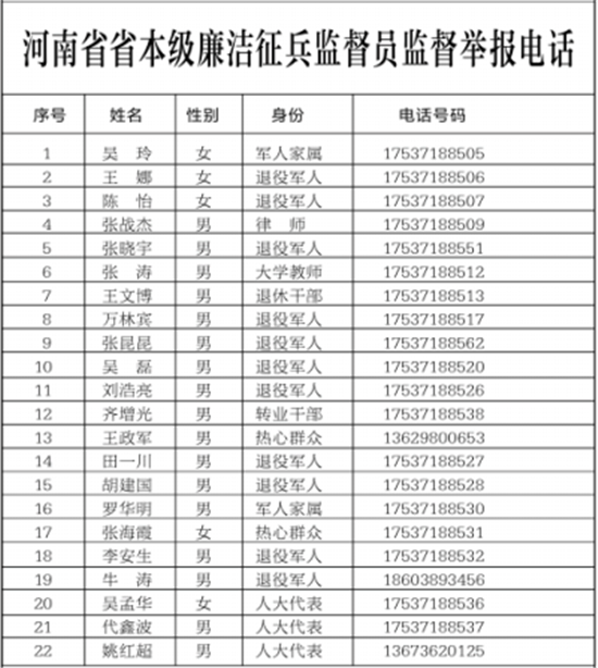為扎實(shí)做好河南省廉潔征兵工作,切實(shí)維護(hù)廣大應(yīng)征青年合法權(quán)益,確保為國(guó)防和軍隊(duì)建設(shè)輸送優(yōu)質(zhì)兵員,現(xiàn)將省本級(jí)廉潔征兵監(jiān)督員和省市兩級(jí)廉潔征兵監(jiān)督舉報(bào)方式予以公示,歡迎社會(huì)各界對(duì)征兵工作予以監(jiān)督。征兵工作政策法規(guī)請(qǐng)關(guān)注“河南征兵”微信公眾號(hào)。