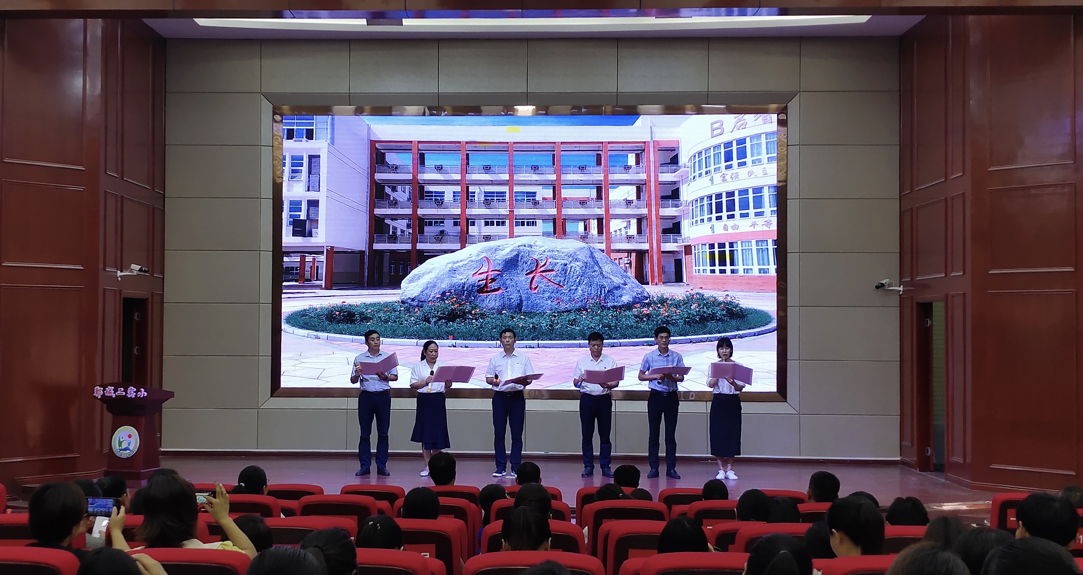 該校校長(zhǎng)陳勇帶領(lǐng)校委會(huì)成員朗誦《校園和諧贊歌》拉開(kāi)了本次慶祝會(huì)的帷幕。