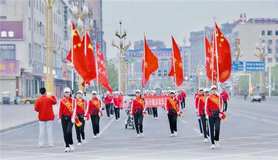 10月11日早晨,鄲城大街上迎來(lái)了一道靚麗的風(fēng)景線——他們身著鮮艷的紅色運(yùn)動(dòng)服,肩扛五星紅旗,手扯橫幅,隨著動(dòng)感十足的音樂,昂首闊步徜徉在金色的秋天里……