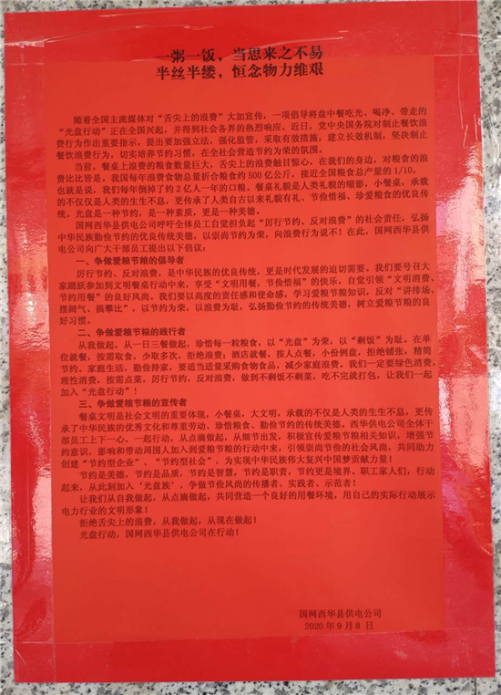 “節(jié)約糧食必須從我們自己做起,從身邊的人做起,更要從小事做起”。該公司職工紛紛表示,勤儉不是吃苦,“光盤(pán)”是節(jié)約,是習(xí)慣,是一種品質(zhì),更是對(duì)黨中央號(hào)召反對(duì)浪費(fèi)的響應(yīng),對(duì)國(guó)網(wǎng)“三節(jié)約”精神的認(rèn)真詮釋和體現(xiàn)!
