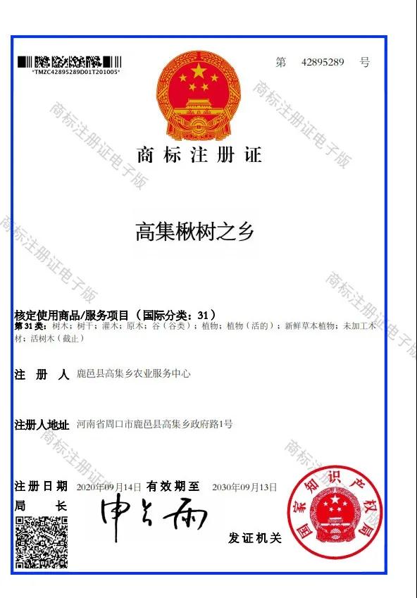 近日,從鹿邑縣高集鄉(xiāng)政府傳出喜訊,由該鄉(xiāng)農(nóng)業(yè)服務(wù)中心注冊(cè)的“高集楸樹(shù)之鄉(xiāng)”商標(biāo),已獲得國(guó)家知識(shí)產(chǎn)權(quán)局批準(zhǔn),注冊(cè)商標(biāo)證書號(hào)為42895289。該商標(biāo)證書顯示,該商品使用服務(wù)的項(xiàng)目為國(guó)標(biāo)31類,有樹(shù)木、樹(shù)干、灌木、原木、植物、活樹(shù)木等類型,商標(biāo)地址為河南省周口市鹿邑縣高集鄉(xiāng)政府路1號(hào),商標(biāo)名稱為高集楸樹(shù)之鄉(xiāng),成為全省唯一一家以鄉(xiāng)鎮(zhèn)命名的農(nóng)產(chǎn)品商標(biāo)產(chǎn)地。自此,楸樹(shù)之鄉(xiāng)高集將會(huì)邁著更加矯健的步伐走出河南、走向全國(guó)。