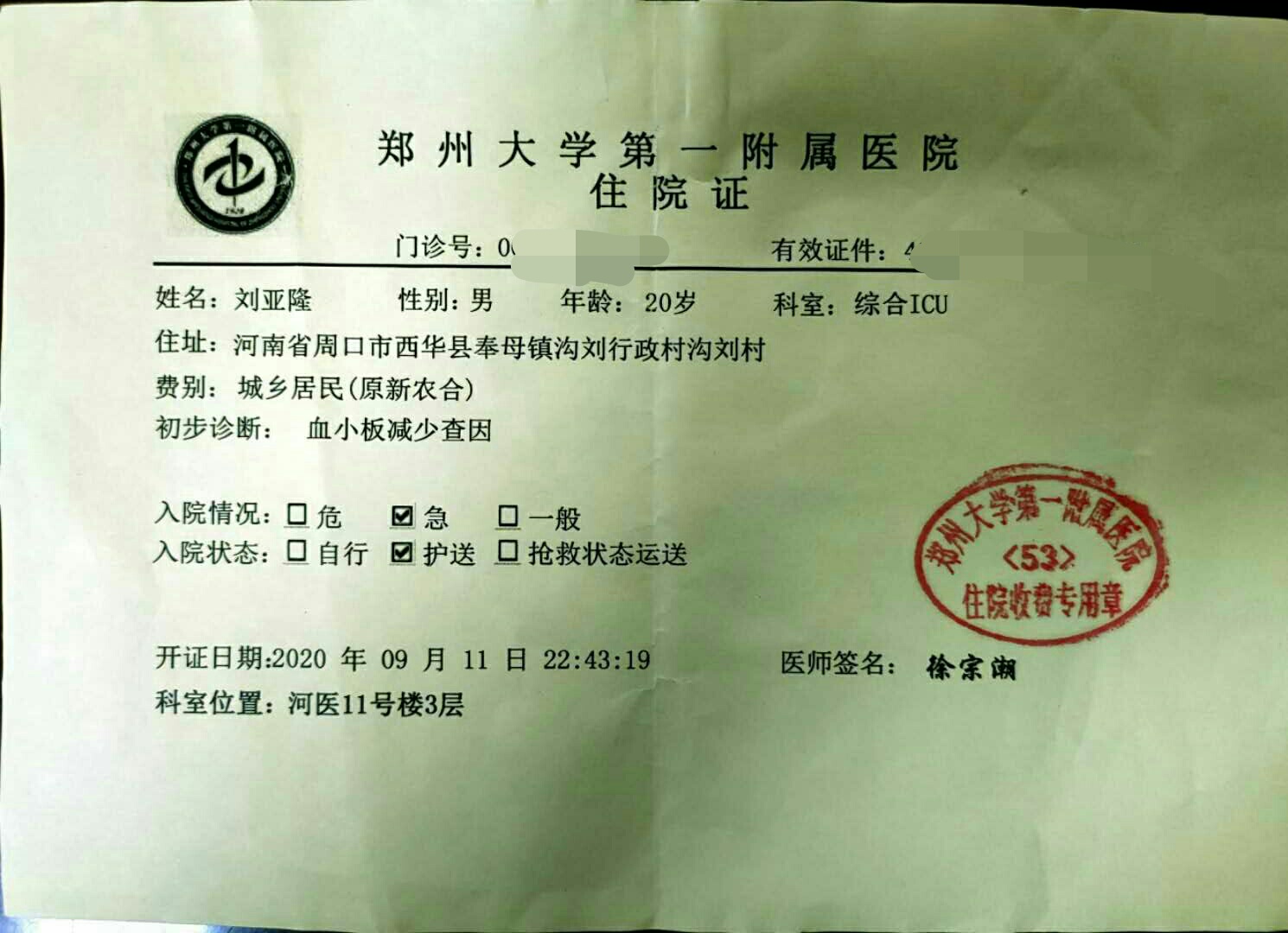 “俺家亞隆今年才20歲,在鄲城一高復讀一年考了653分,考上‘雙一流’。本來開開心心的,到9月份要開學了發(fā)現他身上有出血點,牙齦還紅腫,就帶他去漯河檢查。開始說是肝上的毛病,查肝的時候發(fā)現血小板特別低,趕緊轉到鄭州,9月15號確診為白血病。還有四天就要上大學了,現在只能申請推遲一年入學。“亞隆媽媽告訴記者。