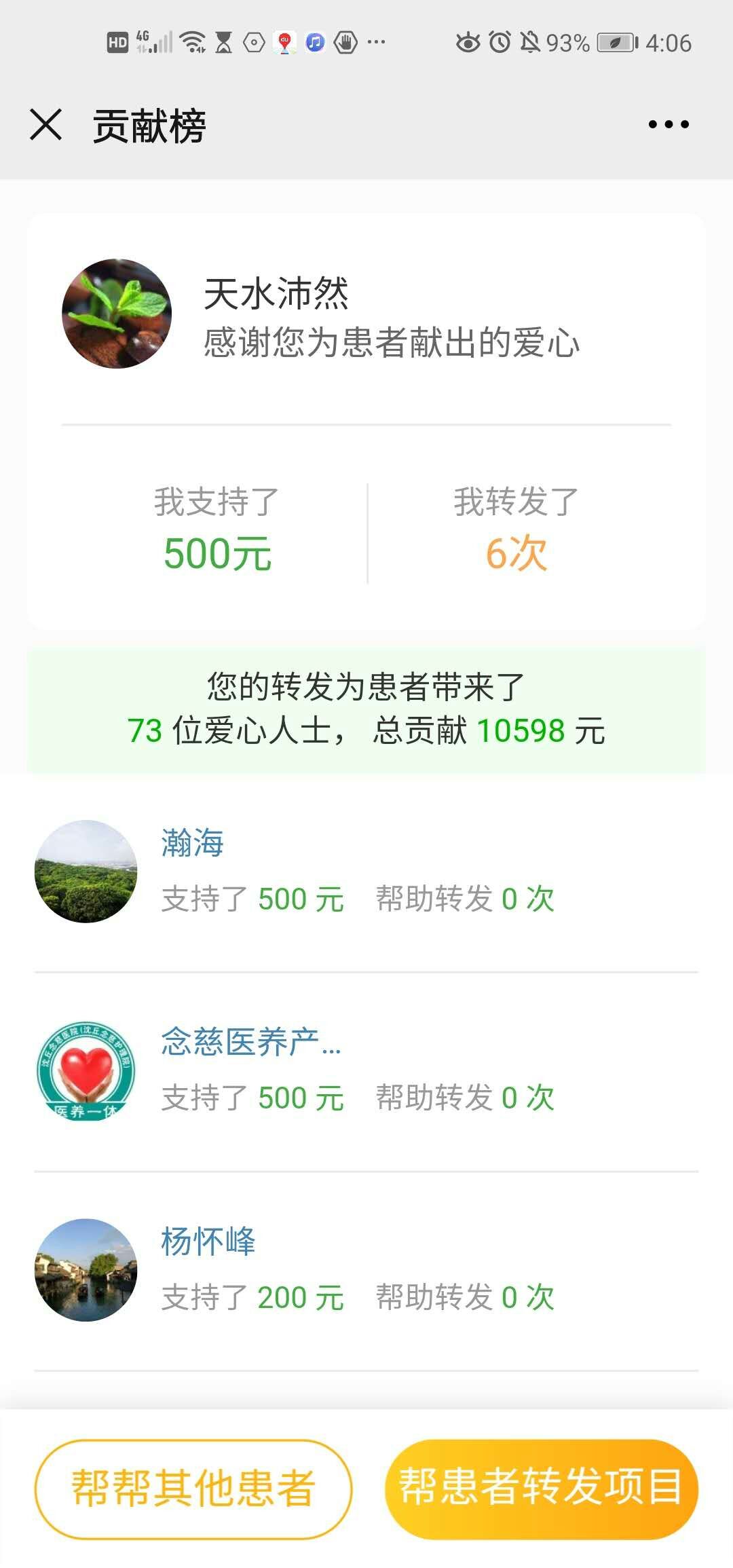 為盡快籌措治療費用,一家人商量后于9月22日在網絡平臺發(fā)起“輕松籌“,截至10月13日已籌得十萬余元,幫助次數2547次,省市周口籍人大代表、政協(xié)委員、企業(yè)家、原西華師范畢業(yè)的師生、小罐茶老總杜國楹等愛心人士紛紛捐款。他在西華二高就讀時,教他英語的謝老師當即借出兩萬塊錢給孩子治病。劉亞隆從小學到高中的同學和老師都發(fā)來問候,有錢出錢,有力出力。“孩子從小就喜歡幫助同學,老師們都知道,這次生病牽動著他們的心,說句心里話他們對亞隆的幫助令我很感動?!眮喡“职终f。