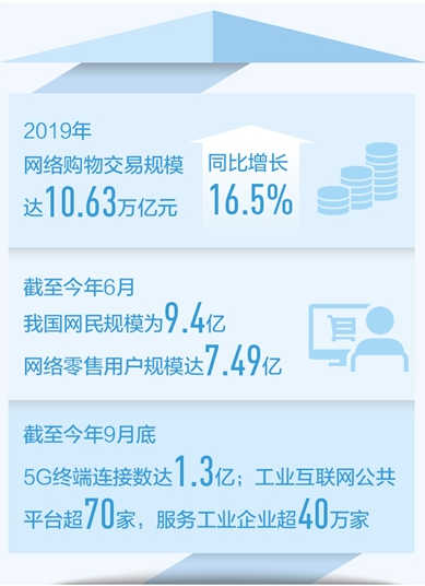 截至2020年6月,我國網(wǎng)民規(guī)模為9.4億,網(wǎng)絡(luò)零售用戶規(guī)模達(dá)7.49億。2019年網(wǎng)絡(luò)購物交易規(guī)模達(dá)10.63萬億元,同比增長16.5%。截至今年9月底,5G終端連接數(shù)達(dá)到1.3億;制造業(yè)數(shù)字化轉(zhuǎn)型穩(wěn)步前進(jìn),工業(yè)互聯(lián)網(wǎng)公共平臺超過70家,服務(wù)的工業(yè)企業(yè)超過40萬家……如今,數(shù)字經(jīng)濟(jì)蓬勃發(fā)展,成為經(jīng)濟(jì)發(fā)展的新增長點,產(chǎn)業(yè)數(shù)字化與數(shù)字產(chǎn)業(yè)化的基礎(chǔ)更加堅實,不斷為高質(zhì)量發(fā)展注入新動能。