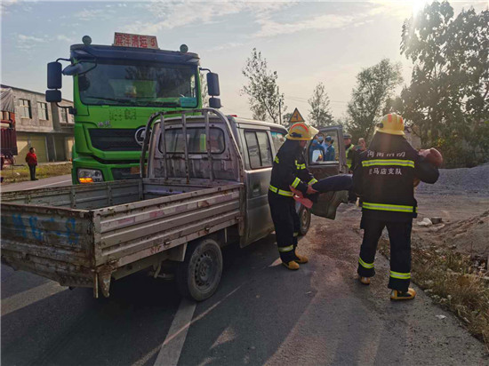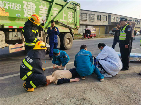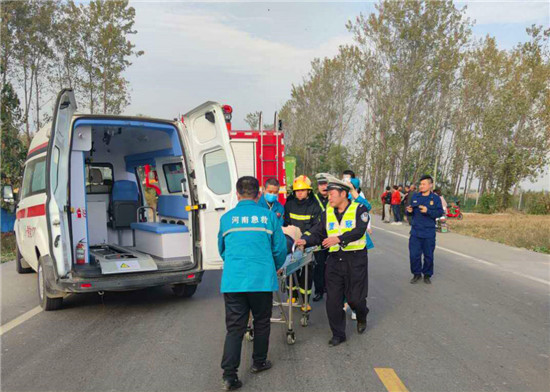 周口市商水縣公安局交警大隊(duì)為提高民警處置國、省道市縣結(jié)合部路段道路交通事故應(yīng)急救援能力,第一時(shí)間救助受傷人員,最大限度將交通事故造成的人員傷亡、財(cái)產(chǎn)損失、環(huán)境污染等危害后果降低到最小限度。10月26日下午3時(shí),在周口市交警支隊(duì)事故科王領(lǐng)科長的協(xié)調(diào)指揮下,商水縣公安局交警大隊(duì)聯(lián)合駐馬店市上蔡縣公安局交警大隊(duì),在223省道(原219省道)商水縣與上蔡縣交界處的上蔡縣華陂鎮(zhèn)賴莊路段,模擬大貨車與微型貨車發(fā)生事故現(xiàn)場,演練省道市際突發(fā)道路交通事故應(yīng)急救援行動(dòng)。