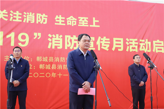 11月11日,鄲城縣在世紀(jì)廣場(chǎng)舉行2020年消防宣傳月活動(dòng)啟動(dòng)儀式,目的是進(jìn)一步提高全民消防安全意識(shí),促使“關(guān)注消防 生命至上”的主題深入人心,廣泛發(fā)動(dòng)社會(huì)各界關(guān)注消防、參與消防,營(yíng)造良好的宣傳氛圍,預(yù)防和減少火災(zāi)事故發(fā)生,確保人民群眾生命財(cái)產(chǎn)安全。縣長(zhǎng)李全林出席會(huì)議并宣布消防宣傳月活動(dòng)啟動(dòng),縣委常委、常務(wù)副縣長(zhǎng)胡友濤主持會(huì)議,縣領(lǐng)導(dǎo)謝超、王彪、陳鳳祥、李素梅及縣公安局政委趙紅建參加會(huì)議。