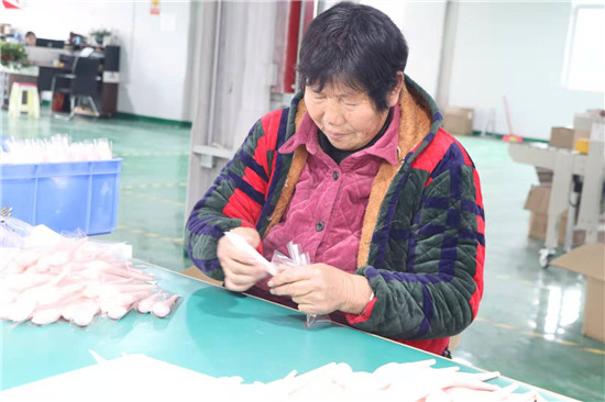 河南雅彩美妝用具有限公司負(fù)責(zé)人趙廣才介紹,公司主要從事化妝刷、美妝用具加工,十分適宜留守婦女干。車(chē)間里的工人基本都是貧困戶(hù)和住在附近的留守婦女。在家門(mén)口上班,既能掙錢(qián),又方便照顧家人。每天中午公司還提供午餐,工人早上來(lái)上班,下午下班不耽誤回家照看孩子?!拔疑习嘁呀?jīng)10多天了,再過(guò)不久,就可以領(lǐng)工資了,真是高興!”68歲的村民張美榮告訴記者,家里孩子們都大了,自己在家閑著也沒(méi)啥事,她就到包裝車(chē)間上班,一個(gè)月算下來(lái)能掙2000多元,活也不重,既鍛煉了身體,又提高了家庭收入。