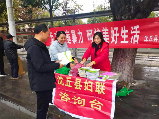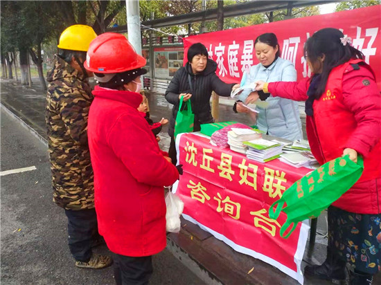 11月25日是國際反家庭暴力日。為進(jìn)一步提高全社會(huì)反家庭暴力意識(shí),加大對《反家庭暴力法》的宣傳,有效預(yù)防和制止家庭暴力,促進(jìn)家庭和諧,保障婦女群眾在婚姻家庭中的合法權(quán)益。為此,沈丘縣婦聯(lián)在城區(qū)組織開展了以“反對家庭暴力,呵護(hù)美好生活”為主題的法治宣傳活動(dòng)。