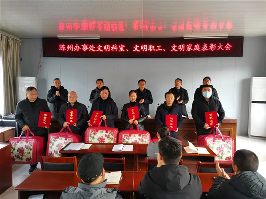 疫情防控辦公室、黨政辦公室獲得“文明科室”稱號(hào);王志國(guó)、史路路獲得“文明職工”稱號(hào);鄒亮家庭、武志強(qiáng)家庭等6個(gè)家庭獲得“文明家庭”稱號(hào)。大會(huì)為獲獎(jiǎng)集體和個(gè)人頒發(fā)了獎(jiǎng)牌、榮譽(yù)證書和獎(jiǎng)品。取得榮譽(yù)的先進(jìn)集體和個(gè)人,集中展示了陳州辦事處的文明形象和干部職工的職業(yè)道德、家庭美德和個(gè)人品德,為文明單位創(chuàng)建增添光彩。