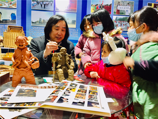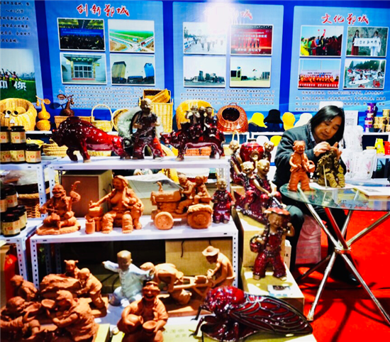 鄲城縣泥塑藝術(shù)大師張振福應(yīng)邀攜48件作品參加大會,成為展會的一大亮點(diǎn)。其中原生態(tài)泥塑作品18件,有《磨豆汁》《耕耘》《酒逢知己》《二胡曲》等,鈞瓷泥塑作品20件,有《大金蟬》《年年有余》《豫東娃》《瑞牛迎春》等。張振福的作品表現(xiàn)豫東的鄉(xiāng)村人物,作品突出個性,憨態(tài)可掬,深受觀眾的喜愛,大家紛紛駐足觀看。