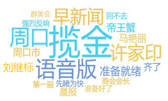 網(wǎng)絡(luò)熱詞反映了網(wǎng)民關(guān)注的重點(diǎn),詞云圖中大大的“攬金”二字占據(jù)詞云圖中央,可見攬金是真的攬金,據(jù)悉,首屆周商大會簽約項(xiàng)目31個,總投資達(dá)429.7億元人民幣。“許家印”“馬艷麗”在整個圖中也是光彩奪目,作為周口人,走上北上廣深的成功人士還心心念念家鄉(xiāng)的發(fā)展,讓老鄉(xiāng)們倍感溫暖,家鄉(xiāng)人關(guān)注他們?yōu)榧亦l(xiāng)發(fā)展做出的努力和他們的動態(tài)也是再正常不過了。
