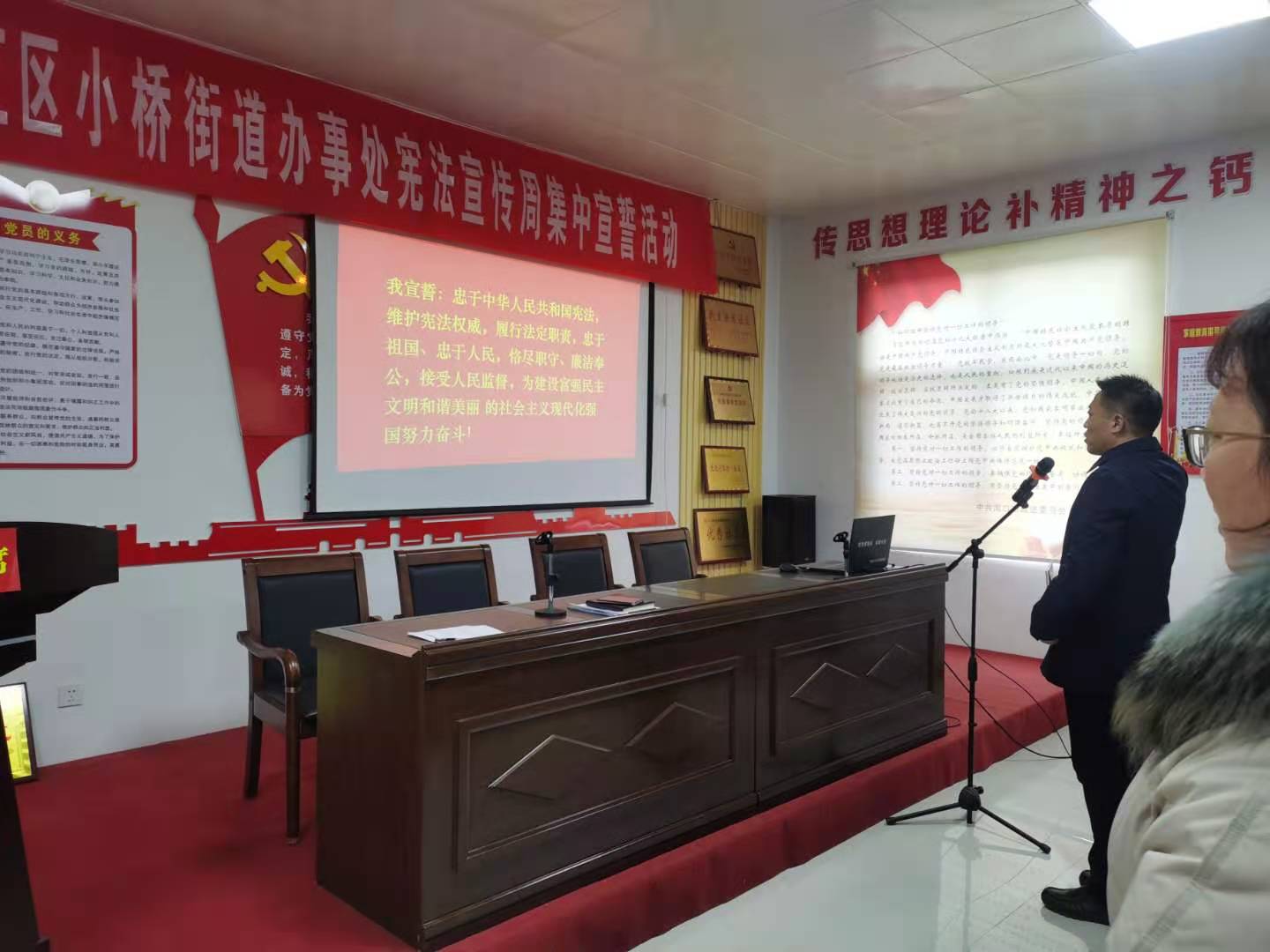 國歌響起,全體人員起立唱國歌。隨后,小橋街道辦事處黨工委書記侯明亮左手撫按憲法,右手舉拳,領(lǐng)誦誓詞,其他宣誓人跟誦誓詞。宣誓后,侯明亮對開展好憲法宣傳周宣傳活動、學(xué)習(xí)黨的十九屆五中全會精神和習(xí)近平總書記關(guān)于憲法的重要論述做了具體安排部署,要求大家要結(jié)合當(dāng)前工作實際,做到依憲施政、依法行政,進(jìn)一步提高尊法學(xué)法守法用法意識。